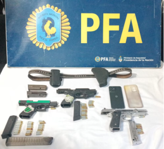 Durante el allanamiento, se secuestraron tres pistolas semiautomáticas, cargadores, municiones y armas con numeración limada, entre ellas una Glock con pedido de secuestro por robo y otra perteneciente al Ministerio de Seguridad bonaerense.