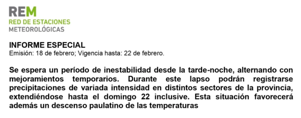 El informe especial emitido este 18 de febrero anticipa que la inestabilidad continuará, alternando con mejoramientos temporarios, hasta el domingo 22 inclusive.