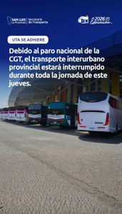 La Unión Tranviarios Automotor (UTA) seccional San Luis anunció que adherirá al paro general impulsado por la Confederación General del Trabajo (CGT), por lo que este jueves no habrá servicio de transporte urbano ni interurbano en toda la provincia.
