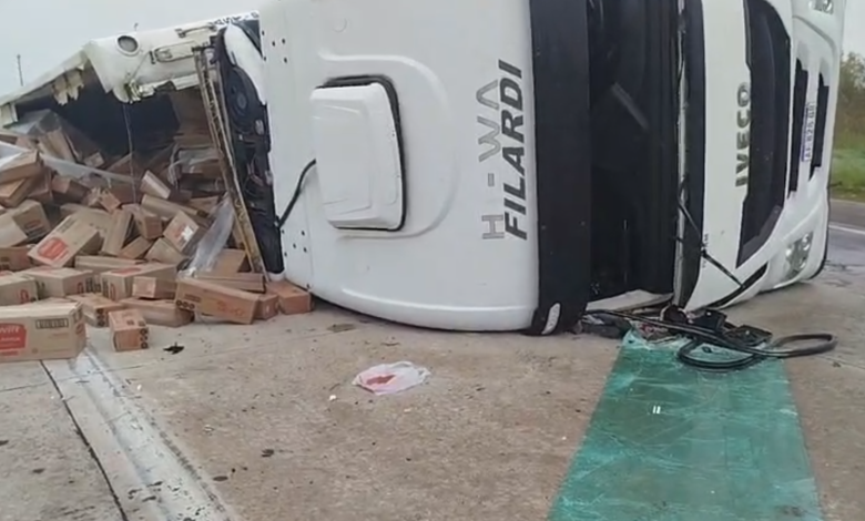 Volcó un camión con productos Swift en la rotonda de Ruta 8 y hubo personas que intentaron llevarse mercadería